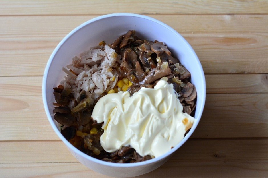 6. Все ингредиенты смешать в чашке, добавить соль по вкусу. Заправить майонезом.