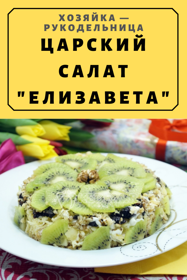 Сверху салат обсыпать рубленными грецкими орехами (100 гр.). По бокам и сверху разложить дольки нарезанного киви.