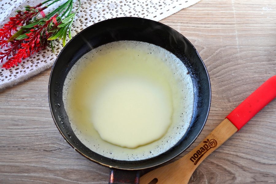 Блины выпекайте на сковороде любого диаметра. Перед выпеканием первого блина смажьте разогретую сковороду растительным маслом, дальше это делать не нужно, так как в самом тесте уже есть масло.