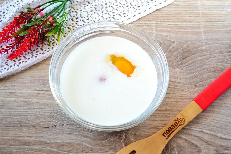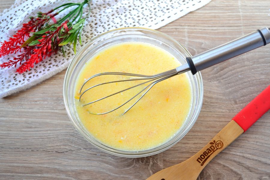 Молоко размешайте с яйцами, сахаром и щепоткой соли.