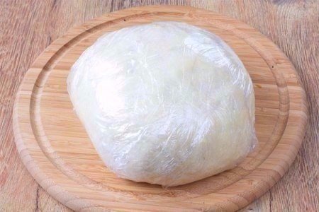 В другую миску большего размера всыпьте оставшуюся муку, вбейте яйцо, добавьте соль и сахар, вылейте водку, масло растительное, оставшуюся воду и заваренное тесто. Тщательно размешайте и замесите тесто до гладкого состояния. Заверните его в пленку пищевую и отставьте отдыхать на полчаса.