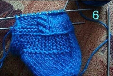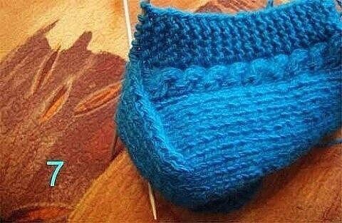 Теперь по краю мыска набираем кромочные петли = по 18 с каждого края. Всего на спицах получится 45 петель. Распределяем их следующим образом : кромочная,5 петель платочной вязки,1 изнаночная,4 петли “жгута”,1 изнаночная,21 петля лицевой глади. Затем 1 изнаночная,4 петли “жгута”,1 изн,5 петель платочной вязки и заканчиваем ряд кромочной петлёй. Смещение петель в “жгуте” делаем в каждом 4 ряду : 2 петли оставить перед работой на всп.спице,2 лиц, затем провязать 2 петли лицевые со вспомогательной спицы. В изнаночных рядах петли вязать по рисунку. Всего 36 — 40 рядов. Это на 36 — 37 размер ноги.