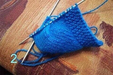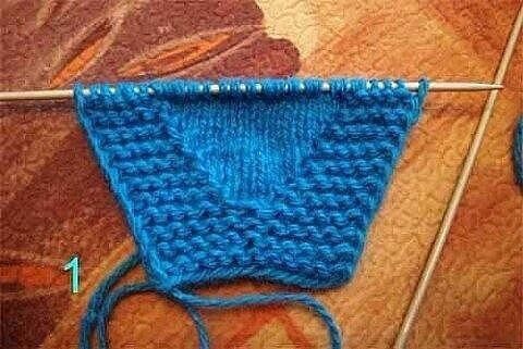 Набираем на спицы 13 петель и вяжем 8 рядов платочной вязкой ( лиц. и изн. ряды — лицевые петли). Затем, начиная с 9 ряда, делаем прибавления петель следующим образом : 1 кромочная,5 петель платочной вязки,накид,1 лицевая,накид,5 петель платочной вязки и заканчиваем кромочной петлёй ряд. В изнаночных рядах петли вяжем по рисунку, накиды — скрещенной изнаночной петлёй. В последующих лицевых рядах делаем накиды ,т.е прибавляем петли после платочной вязки и до неё. Изнаночные ряды по рисунку, накиды скрещенной петлёй. Повторяем ряды до тех пор, пока на спице будет 39 петель ( см.фото)