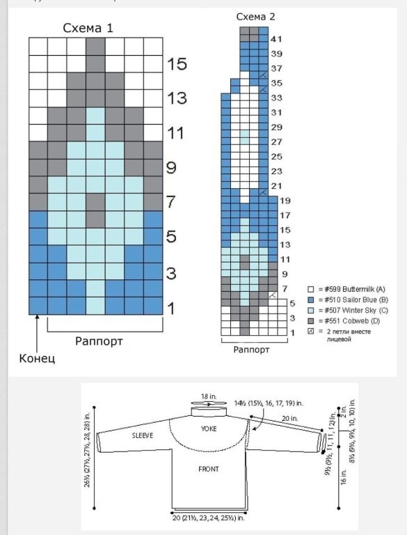 Перехoдим на спицы 5 мм и вяeм узором по схеме 1., когда схема будет закончена перейти опять на спицы 4.5 мм и вяжем только белой (А) нитью лицев.гладью.