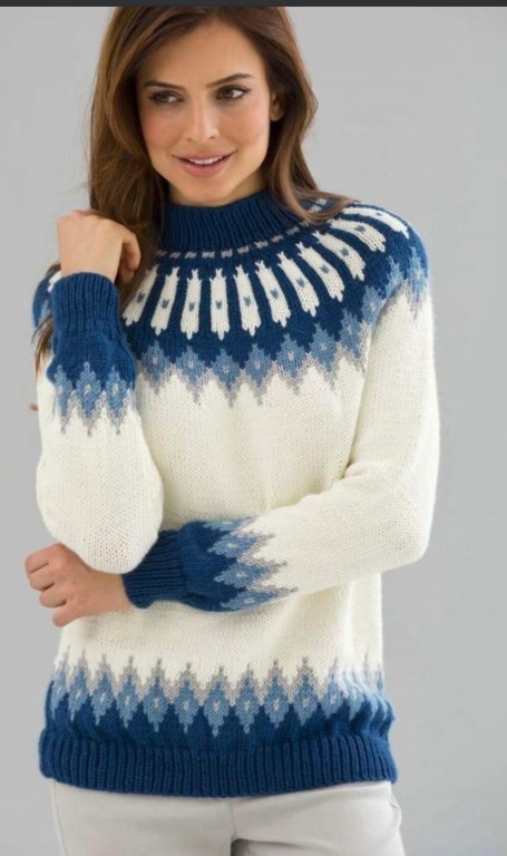 Вязаный спицами классический свитер с красивым скандинавским узором на круглой кокетке. Очень удачная модель, которая не поддается веяниям моды и прослужит Вам верой и правдой несколько сезонов.