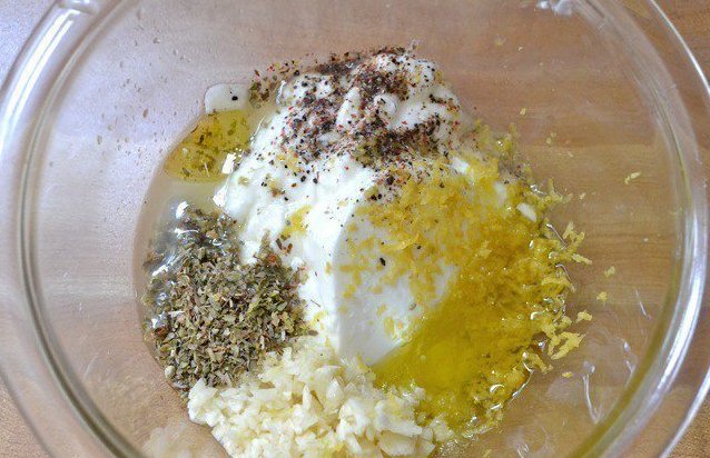 2. Готовим соус: выдавливаем сок лимона. Смешиваем его с приправами, солью и измельченным чесноком.
