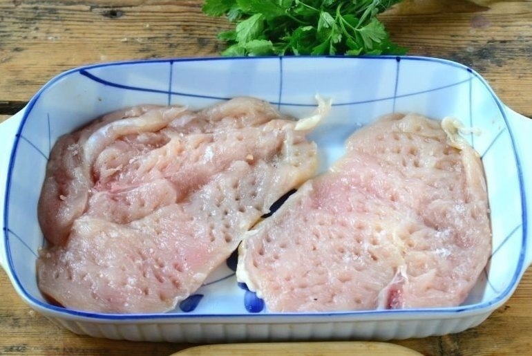 2. Разрежьте грудку вдоль пополам и слегка отбейте каждый ломтик с обеих сторон. Ломти должны получиться не слишком тонкими – примерно 1 см в толщину. Выложите грудки в жаропрочную форму для запекания.