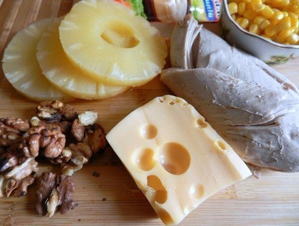 Для приготовления салата с курицей, сыром и ананасом понадобится: