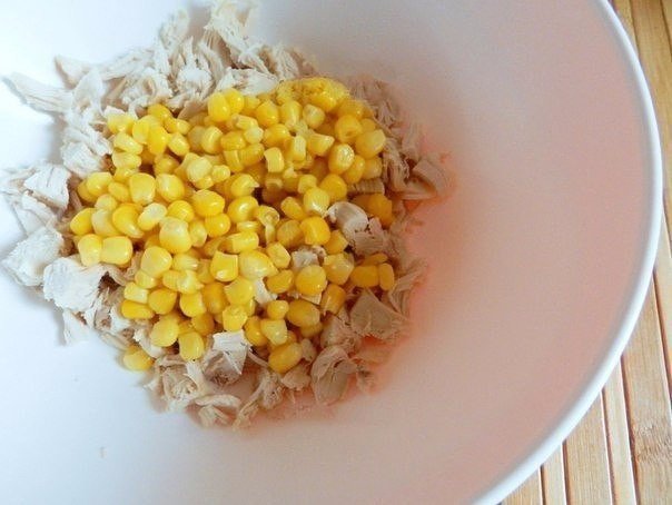 Куриное филе остудить и нарезать небольшими кусочками. Смешать с кукурузой.