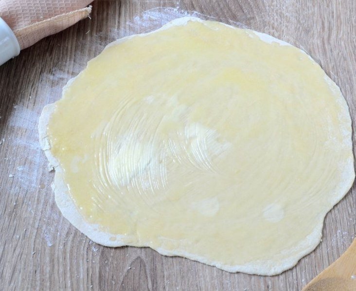 7. Первый круг смажьте растопленным сливочным маслом, это очень удобно делать кулинарной кистью. Накройте сверху вторым пластом теста и снова смажьте маслом.