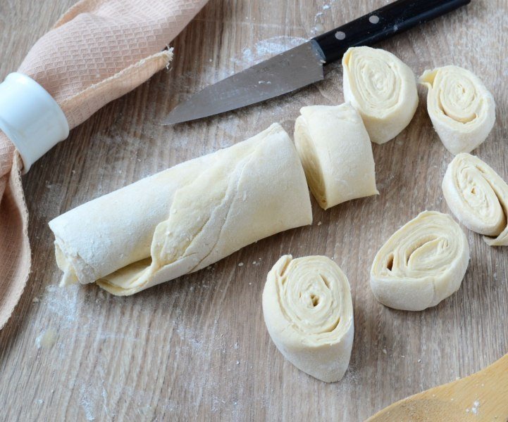 9. Сверните полученный пласт в тугой рулет и разрежьте его на куски шириной 3–4 см.
