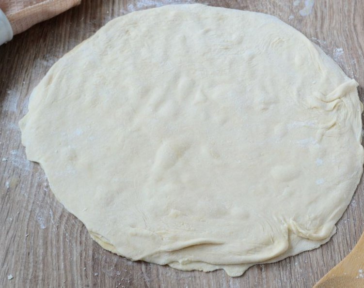 6. Разделите тесто на 4 равные части. Каждую часть раскатайте тонко в форме круга.