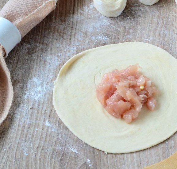 10. Каждый маленький рулетик раскатайте тонко, в центр положите начинку.