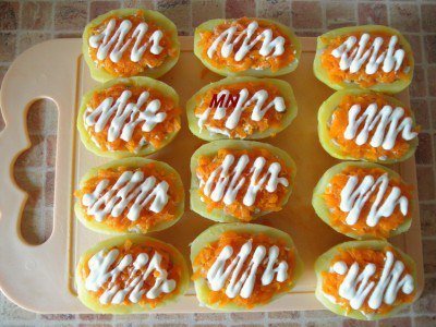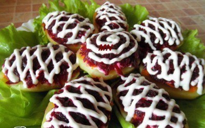 10. Верх лодочек так же смазать майонезом. Подавать можно и сразу, но лучше дать немного постоять (1-2 часа). Не рекомендую делать накануне, так как свекла обычно дает много сока, что окрасит картофель и лодочки не будут так эффектно смотреться.
