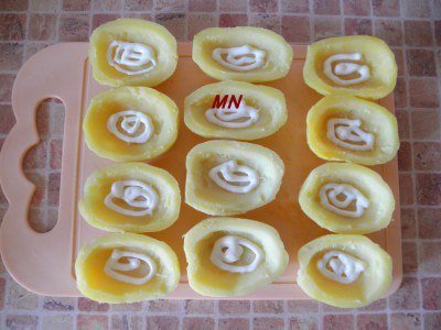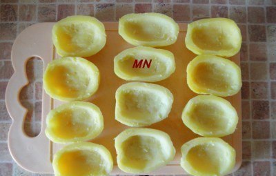 3. Подготовленный картофель разрезать вдоль пополам, немного срезать снизу, чтобы лодочка стояла устойчиво, и вынуть середину, оставив контур не более 0,5 см. (я обычно подрезаю по внутреннему контуру ножом и потом достаю серединку чайной ложкой).