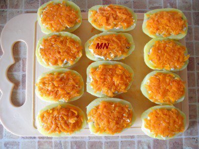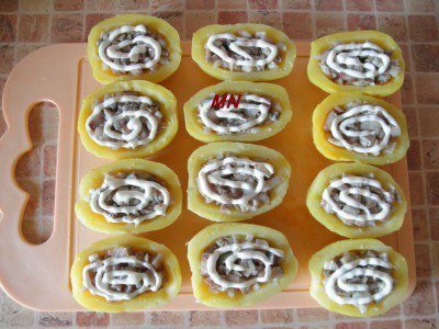 6. Подготовленной луково-селедочной смесью плотно заполнить лодочки до краев. Смазать немного майонезом.