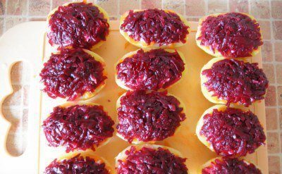 9. Сверху накрыть шапочкой из натертой на крупную терку свеклы.