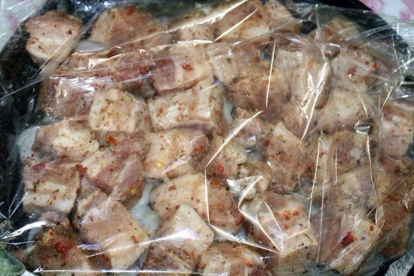 1.Нарезать мясо небольшими кусочками. Добавить смесь перцев, приправу, 1 столовую ложку уксуса и лимонный сок.