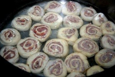 Если пласт большой,его можно разрезать пополам и скрутить рулетик,тогда штрумбы будут размером с большой пельмень. Если же не разрезать на две части,рулет получится большим в объёме и сам штрумб соответственно тоже.