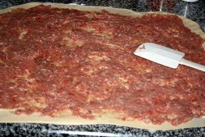 В фарш добавить рубленный лук, соль, перец. Раскатать тесто тонко, разложить начинку, лопаткой разровнять по пласту.