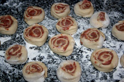 2. Нарезать кусочками(получаются столбики),а затем примять-придавить пальцами столбик на припыленном мукой столе.