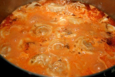 3. В это время обжарить лук. Добавить томатную пасту и сметану. Посолить, поперчить.