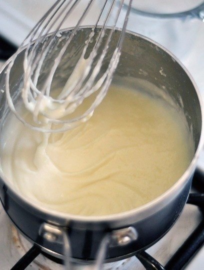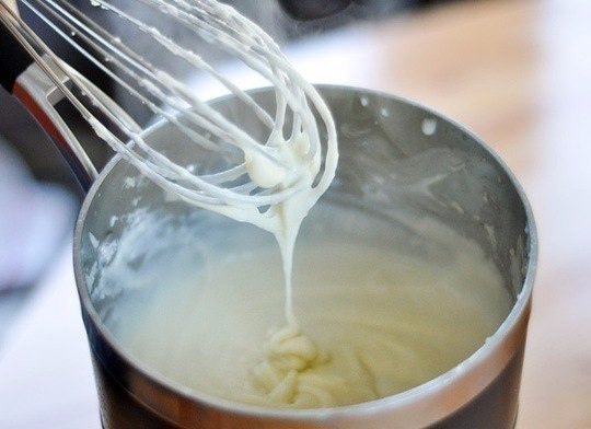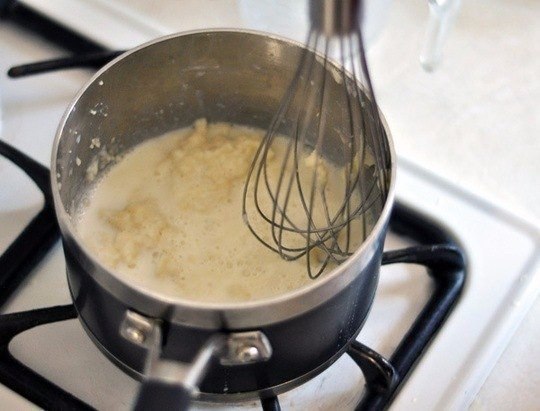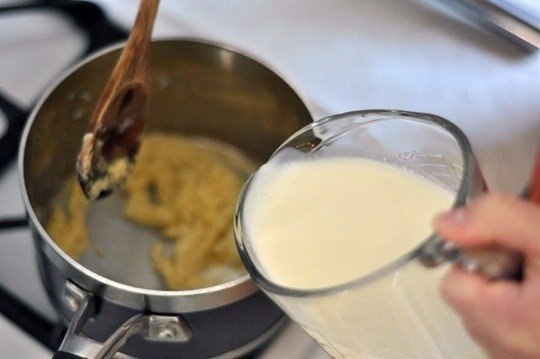 7) Теперь с помощью венчика, перемешивая соус, влейте оставшееся молоко.