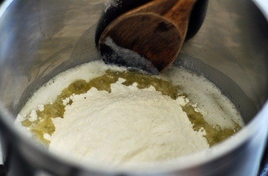 6) Масляно-мучная смесь должна немного подсохнуть и потемнеть. В итоге должне получится золотистый оттенок. Через 5-8 минут после муки влейте пару столовых ложек горячего молока.