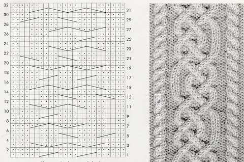На этой схеме — левая часть узора. Правая половинка вяжется так же, но в зеркальном отражении. А между правой и левой частями узора — две или три петли платочной вязки.