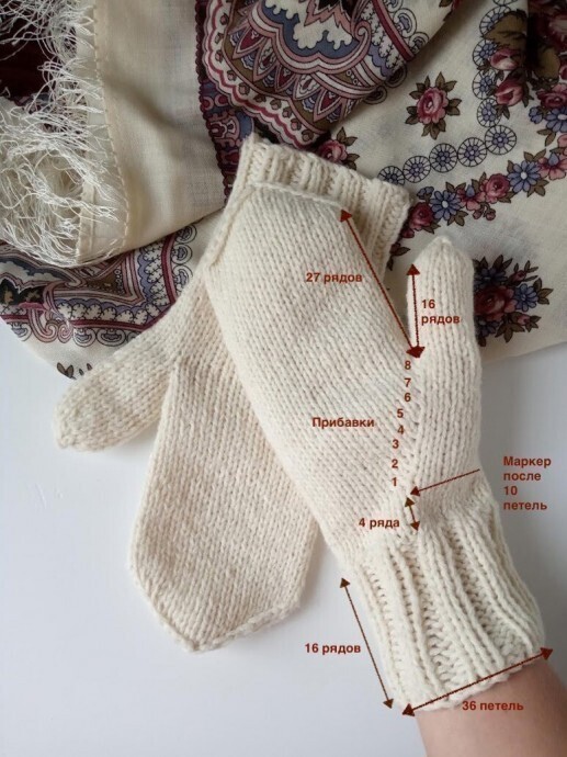Для левой рукавицы маркер ставим после 8-ми петель с начала ряда и прибавки делаем после маркера, скрещенным влево накидом.