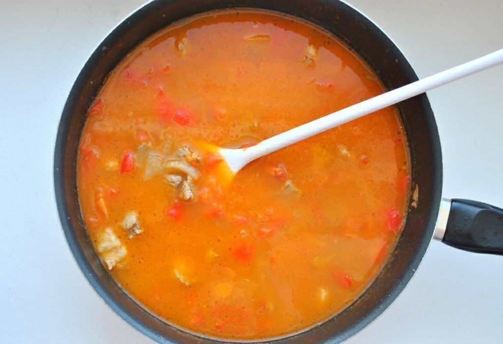 Затем влить теплый бульон, довести до кипения, уменьшить огонь до среднего и варить до готовности (около часа).