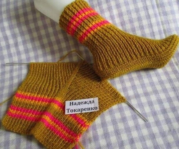Затем сшила сзади. Вот и всё! Из комментариев: Не довязывая по 6 петель на спицах, начинаю убавлять средние 3 петли подошвы в каждом лиц. ряду, пока не останется одна от подошвы,а дальше не сшиваю иглой, а соединяю вязальными спицами, как у шали кайму. Не забывайте про убавку по бокам.