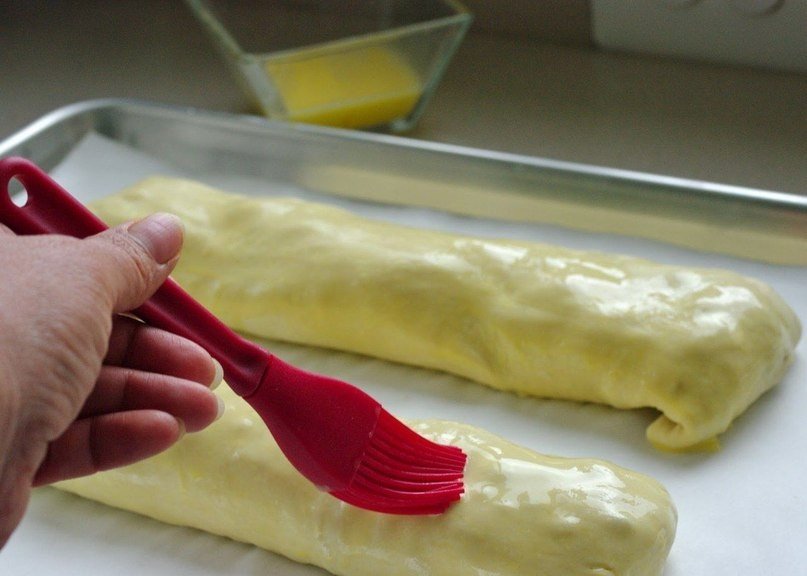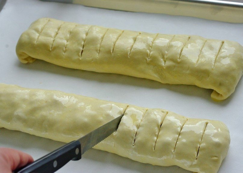 Загните края рулетов. Выложите рулеты на противень, застеленный бумагой. Смажьте яичной смазкой. Сделайте продольные надрезы на каждом рулете.