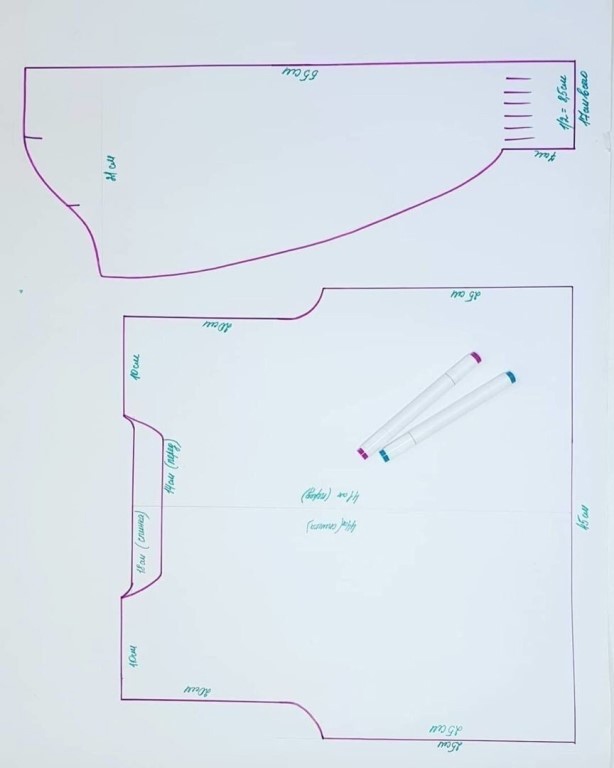 Выкройку начинайте с обхвата груди (например ОГ 120 см, значит ширина спинки 60 см, а перед (планки) больше на 5 см, чтобы был нахлест = по 35 см, определите желаемую длину изделия, длину рукава, пройму и вырез горловины.